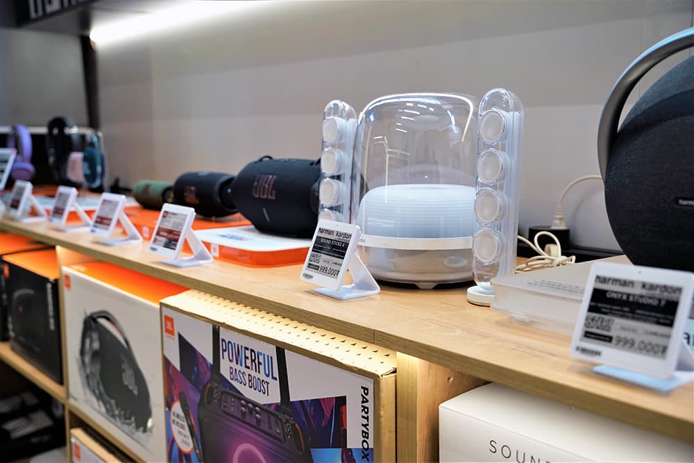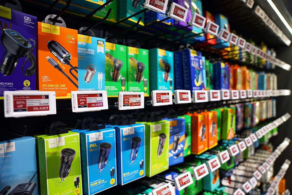 تم دمج علامات إلكترونية داتالن (Datallen) بسلاسة في مساحة البيع بالتجزئة للمتجر، متوفرة بأحجام مختلفة من 2.13 بوصة إلى 7.5 بوصات. تم اختيار أحجام مختلفة من علامات الورقة الإلكترونية لفئات مختلفة من المنتجات، مما يضمن عرض معلومات المنتج بوضوح دون التداخل مع جماليات المتجر. من المنتجات الصغيرة مثل كابلات USB إلى المنتجات الكبيرة مثل صناديق الحفلات وأنظمة الصوت، لعرضت العلامات الأسعار في الوقت الفعلي، ومواصفات المنتج، وتعليقات العملاء بتنسيق مبسط وسهل القراءة.